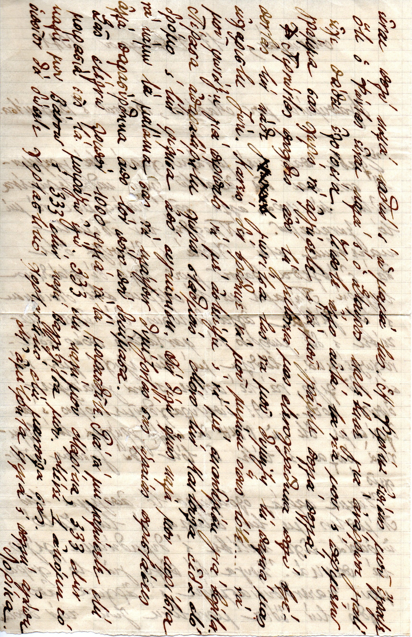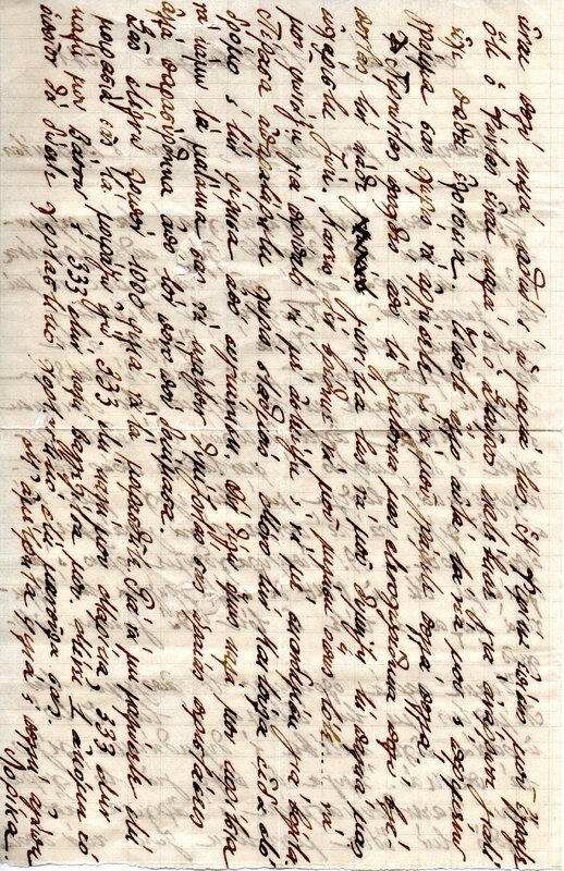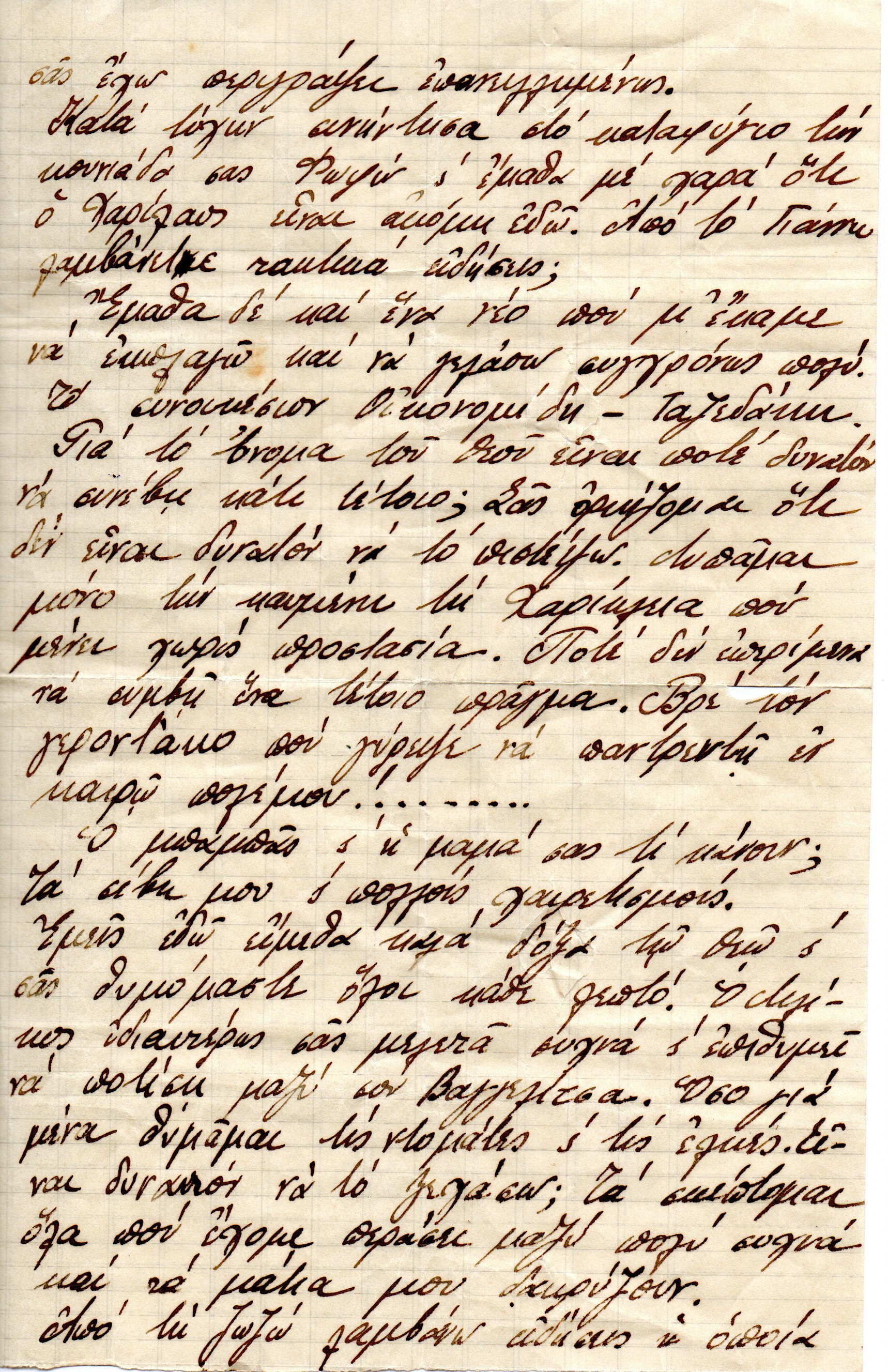 ….. also wrote to me that ….. is well, and Stavros went down to recover because he had malaria. Nothing else, that was my news and I am waiting for your letter without delay and to write me many things. Passing through our neighborhood yesterday, I was very sad to see every corner of it reminding me of our old pleasant life. No one was there to ……. Like back then. To call me for a walk, to joke with me or to ……. For a walk.
