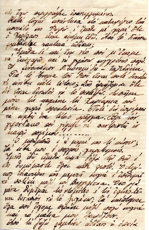 What are his dad and your mom doing? My respects and many greetings.We are well here, thank God, and we all remember you every minute. Nikos especially, studies you often and wishes to be with you, Vagelitsa.