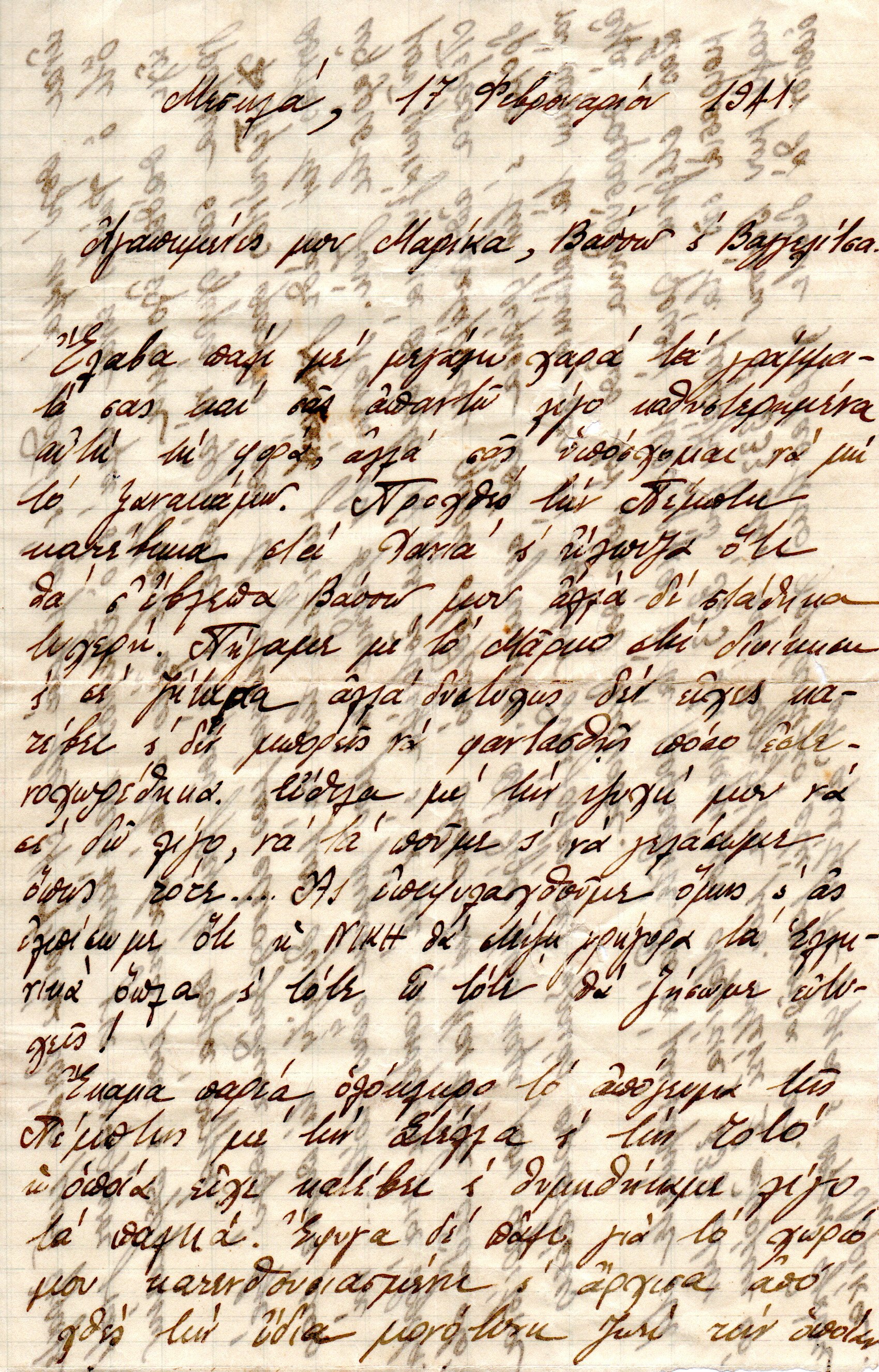 Handwritten letter in Greek by Lorika Izhaki addressed to Marika Tzavoudaki written on February 17, 1941. Ink on paper.